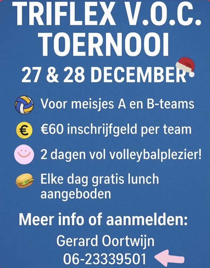 De organisatie Triflex V.O.C. organiseert dit jaar een 2 daags volleybaltoernooi.